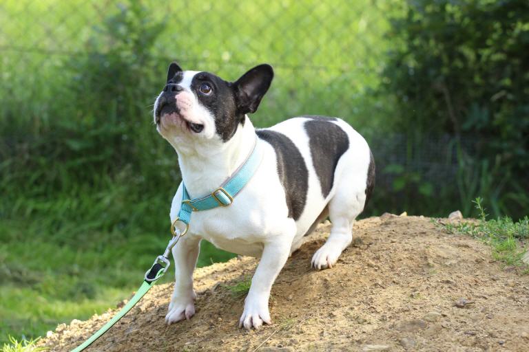 Die Leine fand er doofer als den Maulkorb. Diesen trägt er entspannt und kann sich nach kurzer Zeit sogar schon frei bewegen .